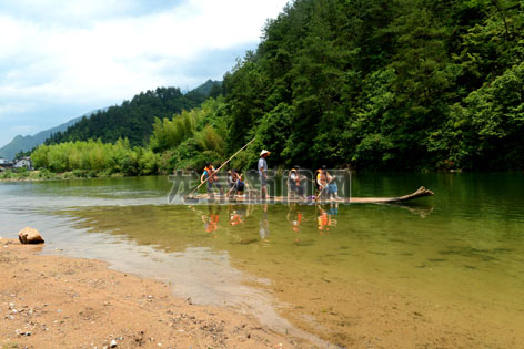 近年来,住龙镇依托山水资源优势,以新省道开通为契机,大力发展生态旅游业,吸引了大量游客前来休闲度假。图为游客在清澈见底的住溪划竹排。