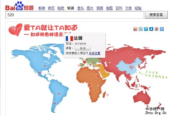 百度知道推出专题活动“爱TA就让TA知道——如何用各种语言表白”告诉你31个国家,21种中国方言如何表达你的爱!搜索百度知道“520”头条,便可体验并参加此活动,百度知道让网友们的表白创意十足!