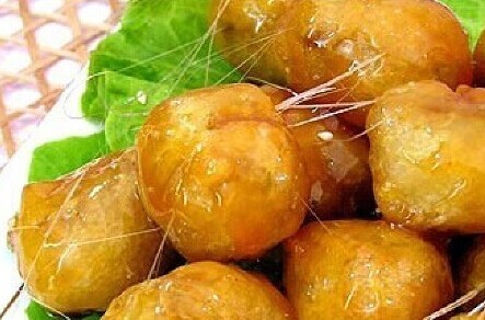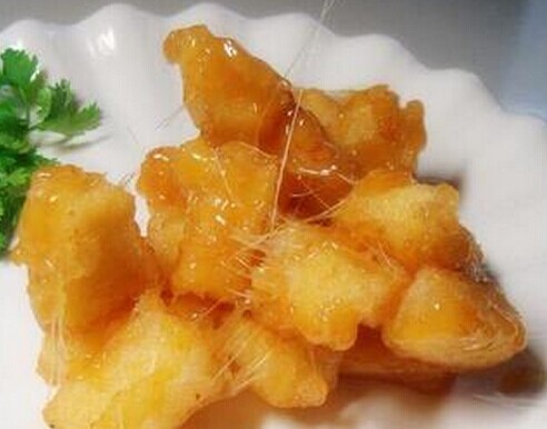 4、炒锅上微火, 用5成油炸熟,趁锅底的油少加一点水然后加100克左右的糖,转成小火熬治,等糖充分化用勺子搅拌呈金黄色时,开起了大泡泡变成小泡泡的时候赶紧下炸好的藕,快速翻炒,使糖汁全部均匀地裹住鲜莲藕,倒入涂有麻油的盘内,撒上芝麻即成就OK了,一定要注意熬拔丝汁的火候,那个是关键,另外拔丝汁温度比较高,小心被烫。