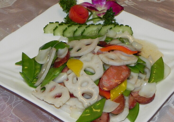 5炒至莲藕变色时加入盐,调入一点生抽提鲜即可,上锅前下葱花。