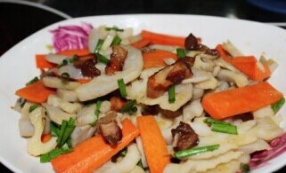 3热油锅,下姜,蒜和腊肉炒香出味至腊肉熟。