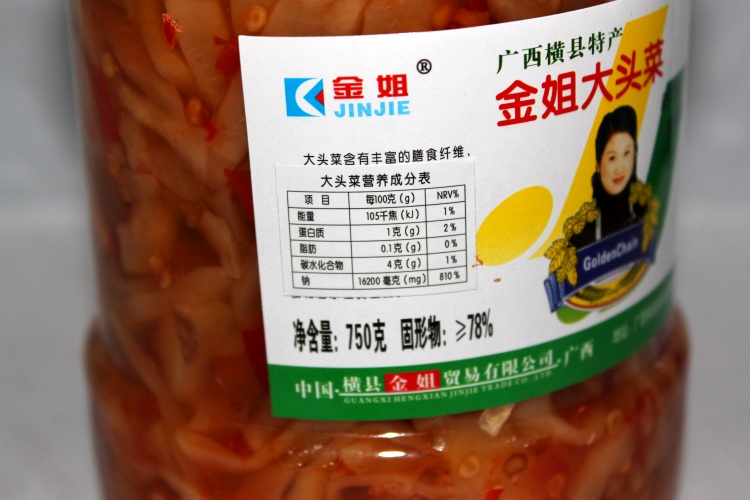 本产品系指定参加首届“中国—东盟博览会”的广西名特优农产品,该企业系广西首家通过国家食品质量安全QS认证的酱腌菜生产企业。金姐芋苗—新口味,酸辣脆!芋苗富含维生素C、碳水化合物及多种有机酸,营养丰富。金姐芋苗选用横县优质芋苗、酸笋、辣椒为原料,采用独特的传统工艺腌制而成,其色泽金黄、爽脆可口、是宾馆酒楼和居家佐餐佳品。